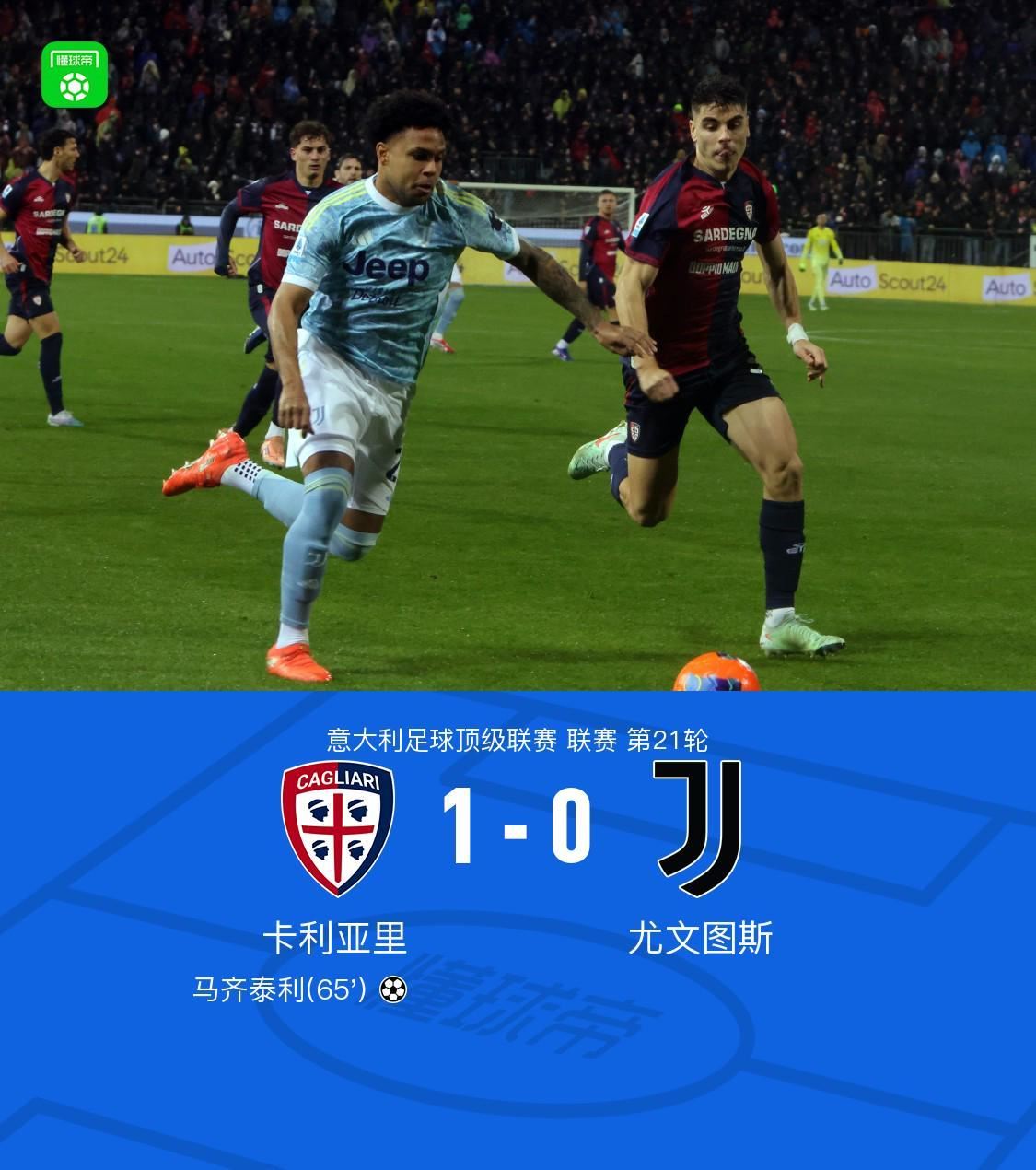 北京时间1月18日,意大利足球顶级联赛第21轮,卡利亚里坐镇主场迎战尤文图斯。上半场,两队均无建树。下半场,加埃塔诺开出任意球,马齐泰利半转身扫射得分。随后,伊尔迪兹射中折射后击中立柱。全场比赛结束,尤文客场0-1不敌卡利亚里。