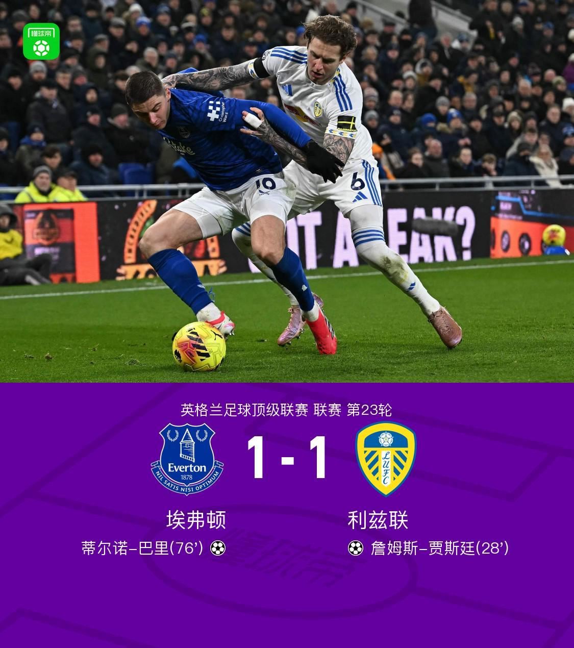 第76分钟,巴里禁区抢点捅射破门,埃弗顿1-1利兹联